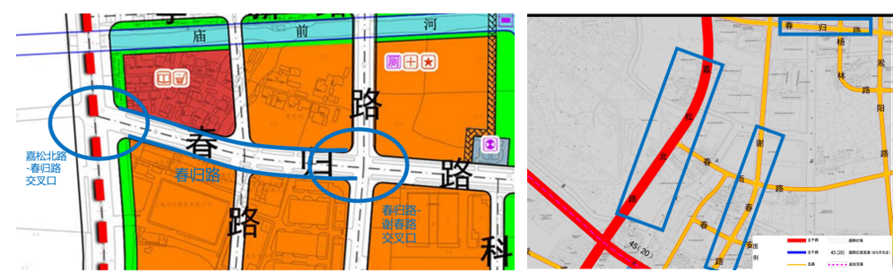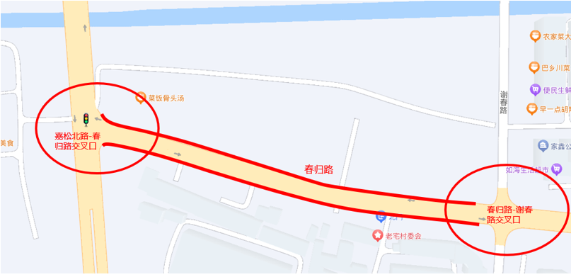 本组选择的两个交叉口及路段为:嘉松北路-春归路交叉口(简称嘉-春交叉口)、春归路-谢春路交叉口(简称谢-春交叉口)以及两个交叉口之间的春归路部分路段。