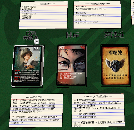 - 传递情报阶段:玩家可选择传递手中任意张数的情报卡,方法包括:密电、直达或文本。- 使用传递方式时可加入【调虎离山】、【截获】等干扰牌进行情报保护或伪装。