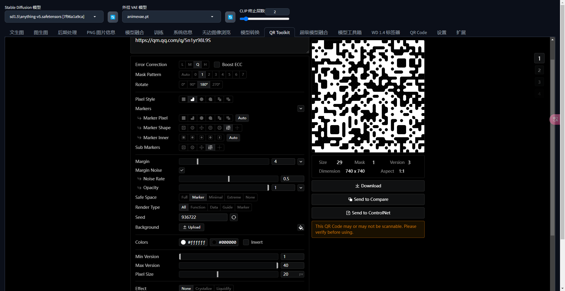 - 打开webUI进入QRtoolkit,输入对应的链接并调整二维码使其均匀,可参考如下,最后扫一下看看能否识别